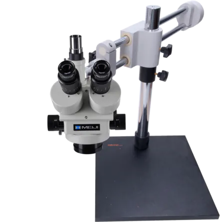 A hanging bar and pivot joint allows for angled viewing from the microscope, and an included headrest helps minimize neck pain and fatigue during extended observation periods. The hanging bar lever is also spring-loaded and can move out of the way without having to release the pre-set tension of the coarse adjustment focus block. NOTE: If using a Meiji EMZ8TR microscope, a spacer (ACRO-SK) will be required.